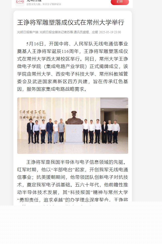 5月16日,開國中將、人民軍隊(duì)無線電通信事業(yè)奠基人王諍將軍誕辰116周年,王諍將軍雕塑落成儀式在常州大學(xué)西太湖校區(qū)舉行。同日,常州大學(xué)王諍微電子學(xué)院(集成電路產(chǎn)業(yè)學(xué)院)正式揭牌成立,該學(xué)院由常州大學(xué)、西安電子科技大學(xué)、常州科教城管委會及武進(jìn)國家高新區(qū)四方共建,旨在傳承紅色基因,服務(wù)國家集成電路戰(zhàn)略需求。
