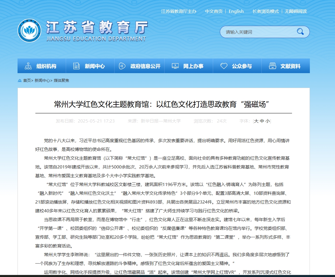 江蘇教育廳官網(媒體聚焦):常州大學紅色文化主題教育館:以紅色文化打造思政教育“強磁場”